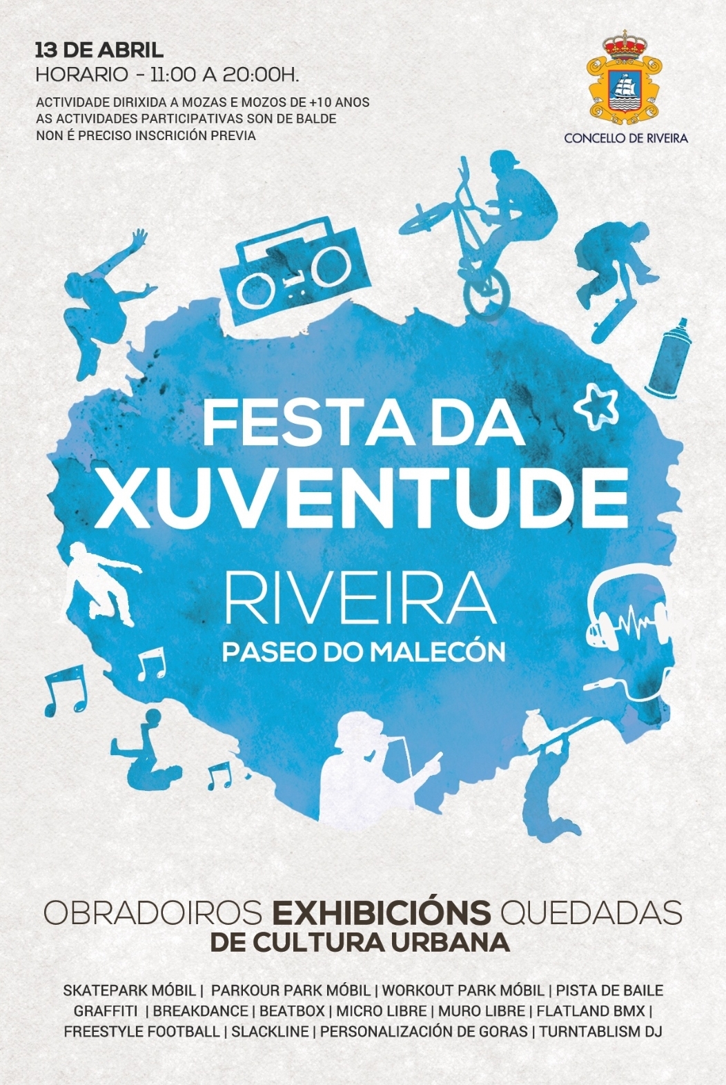 Xa temos cartel da Festa da Xuventude de Riveira que terá lugar o sábado 13 de Abril no paseo do Malecón e na que toma protagonismo a Cultura Urbana da man da Vella Escola cunha chea de disciplinas que estarán presente durante toda a xornada das 11 ás 20 horas en formato obradoiros e exhibicións.