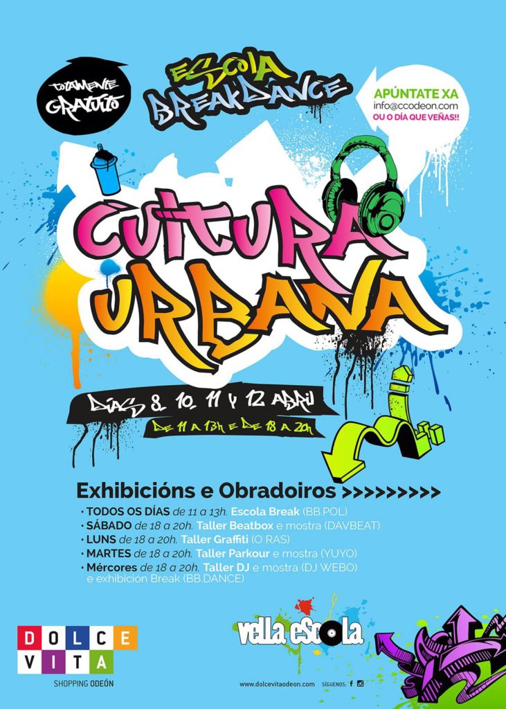 Obradoiros de Cultura Urbana (Graffiti, Breakdance, Beatbox, Turntablism Dj e Parkour) e exhibicións no Centro Comercial Odeón (Narón) con Vella Escola os días 8,10,11 e 12 de Abril.