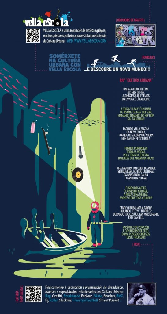 Nesta ocasión deseñamos unha infografía sobre novas metodoloxías para dinamizar a lingua galega entre a mocidade a través do ocio, concretamente mediante a Cultura Urbana.