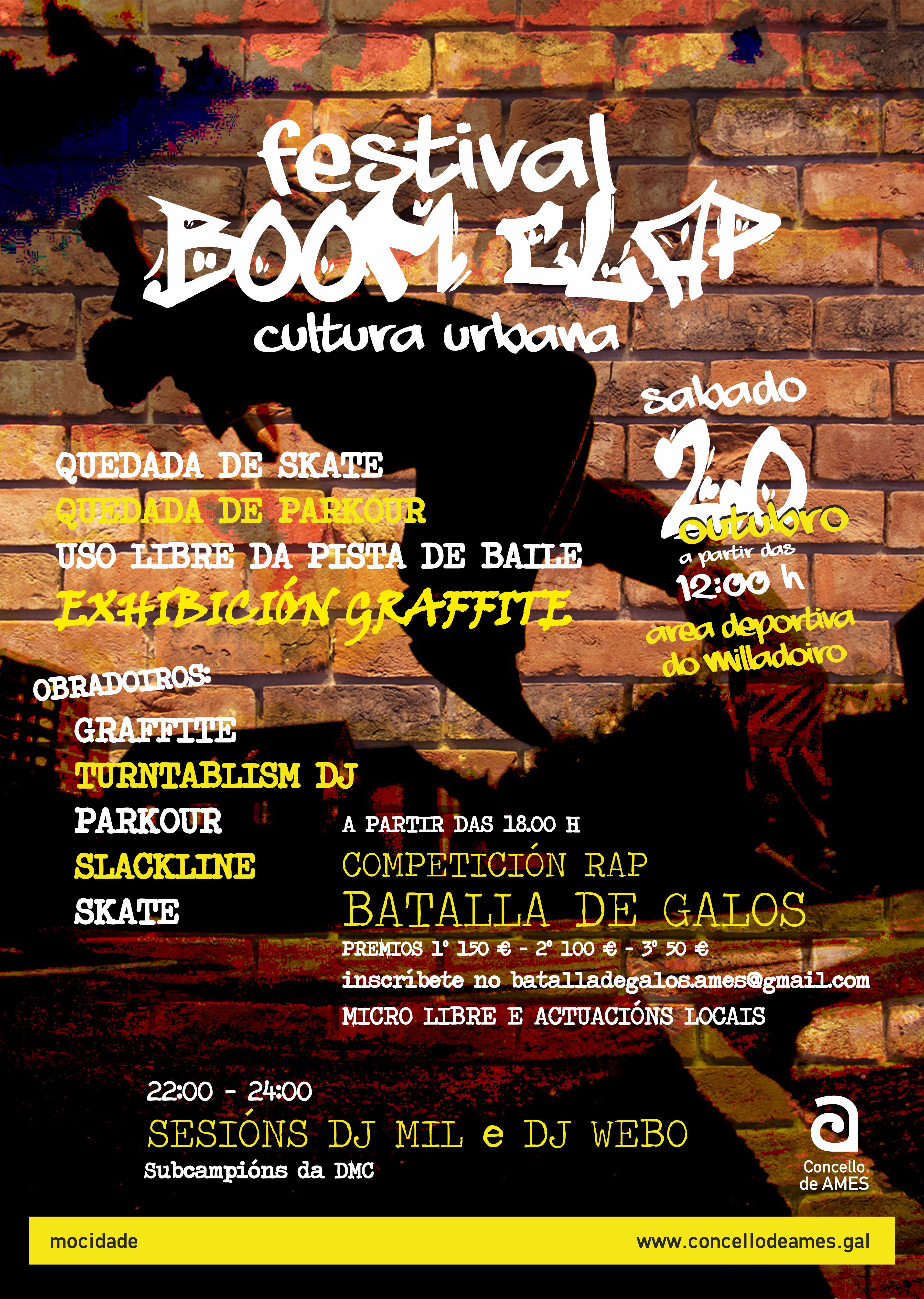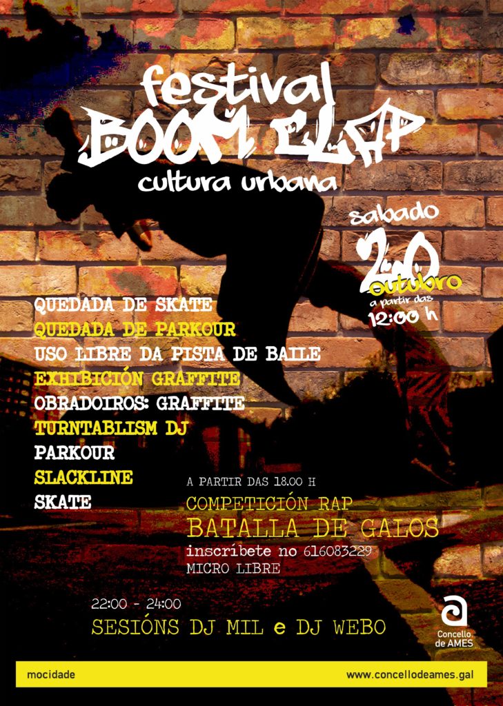 Os da Vella Escola presentamos a primeira edición do Festival de Cultura Urbana «Boom Clap» que terá lugar nas pistas polideportivas de Milladoiro (Ames) o vindeiro sábado 20 de outubro das 12 da mañá ás 24 horas.