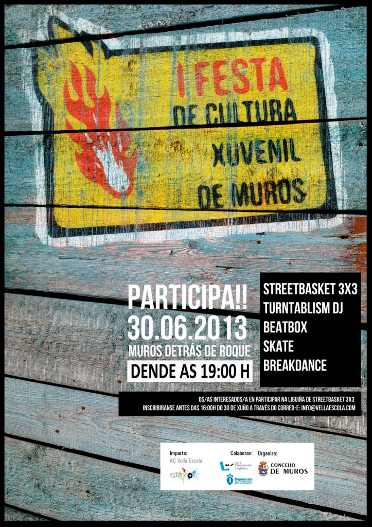 Vella Escola e o Concello de Muros organizan a  «I Festa de Cultura Xuvenil de Muros» que terá lugar o domingo 30 de xuño a partir das 19:00 horas na zona do porto (detrás de Roque). Esta xornada estará dedicada á Cultura Urbana cunha oferta variada de actividades nas que poderán participar de balde tódolos mozos e mozas que o desexen.
