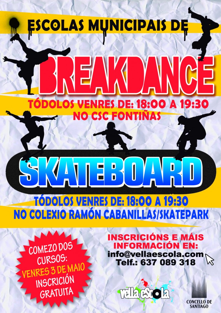 Durante este mes de setembro continuamos coas Escolas Municipais de Breakdance e Skateboard que se impartirán os venres en horario de 18:00 a 19:30. Os lugares onde terán lugar as clases son o Centro Sociocultural de Fontiñas (Breakdance) e o Skatepark da Plaza do Parlamento (Skate). No caso de choiva para esta última actividade suspenderase a sesión.